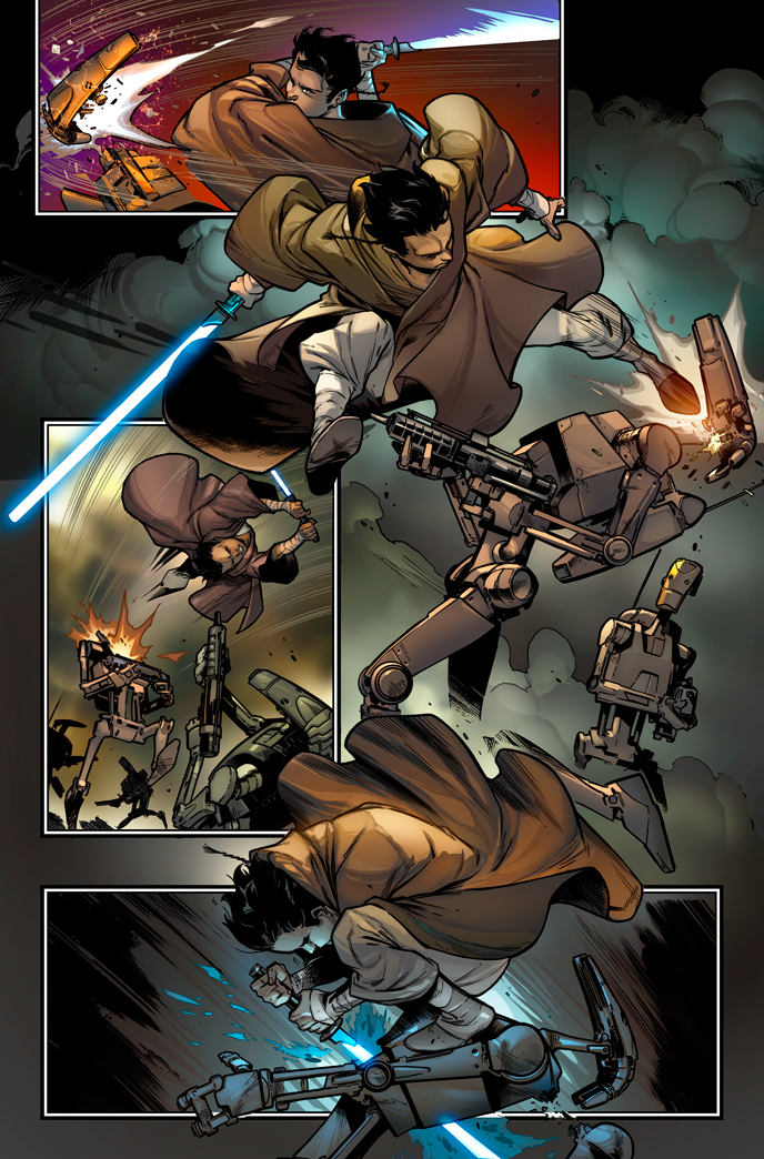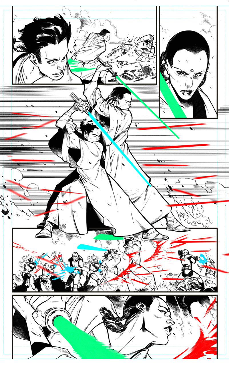 Una de las características del universo Star Wars es que los fans son tremendamente ilustrados en la materia y están muy alerta. Así que cuando tomé el proyecto traté de ser más “papista” que el Papa. Esto me llevó a referenciar todo o casi todo lo que sale en el tebeo, me refiero a que si sale una pelea de espadas láser, he estado viendo las escenas de lucha de Star Wars, me he visto videos de gente en youtube haciendo esa forma concreta de esgrima Jedi, la 3, llamada “soresu”. Hay videos de gente que la práctica y se lo tengo que agradecer muchísimo. ¡Incluso un amigo me regaló el libro de La Senda Jedi cuando supo que iba a encargarme de la serie y lo usé como referencia (muy útil, por cierto)!